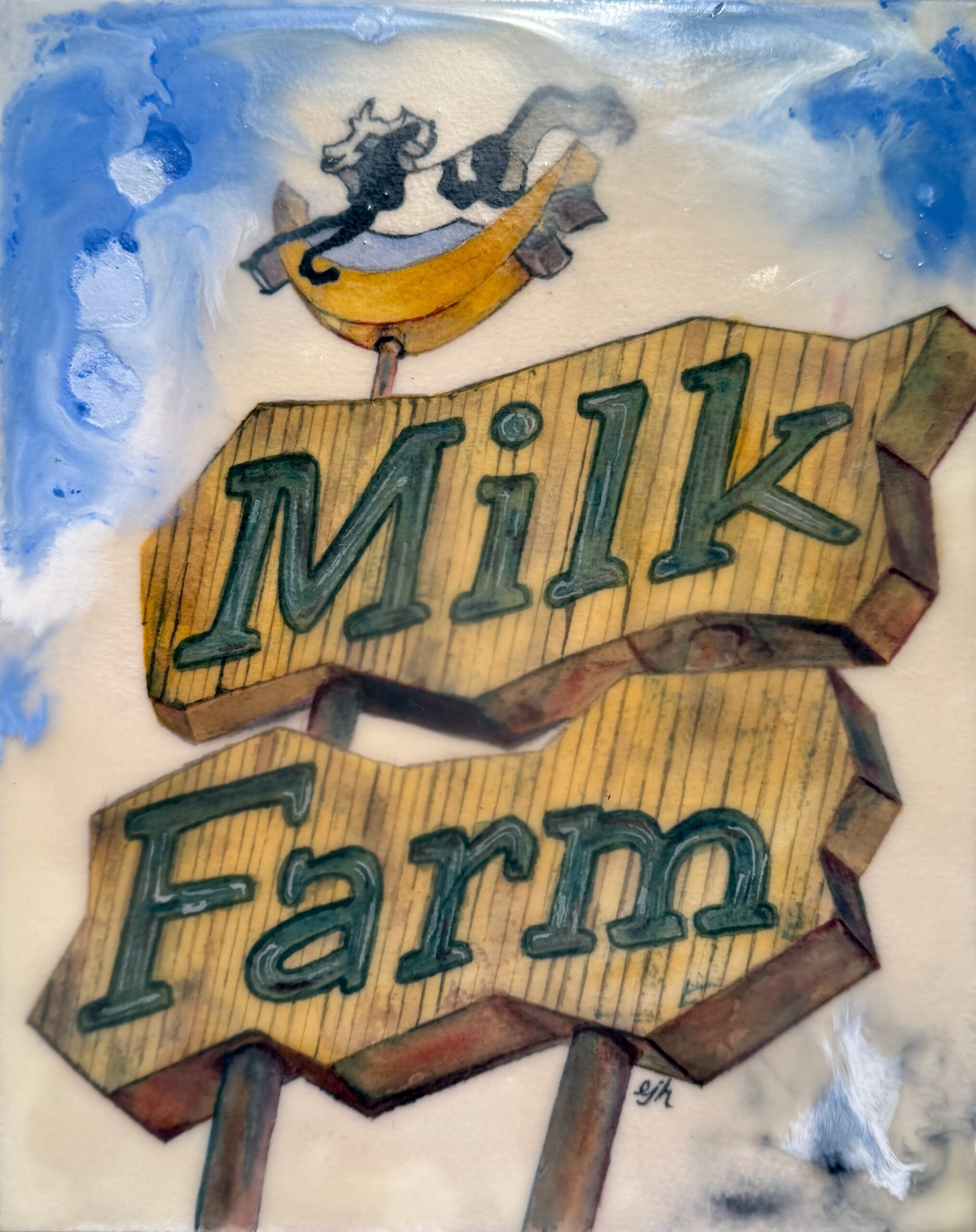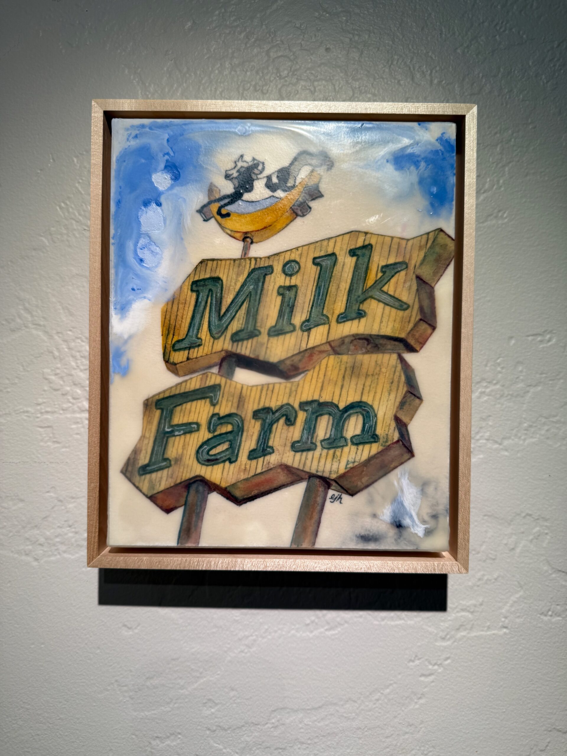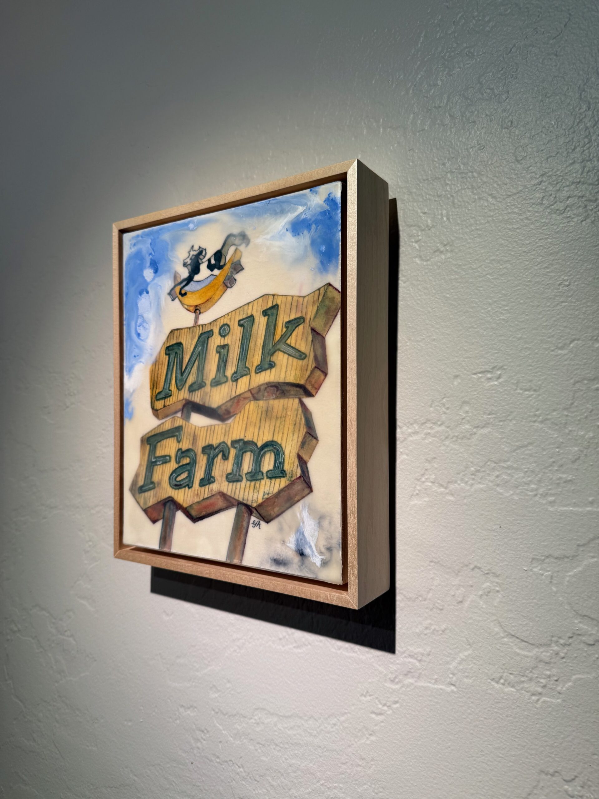 watercolor on paper with encaustic medium, mounted on 1.5″-deep cradled birch panel, set in maple floating frame